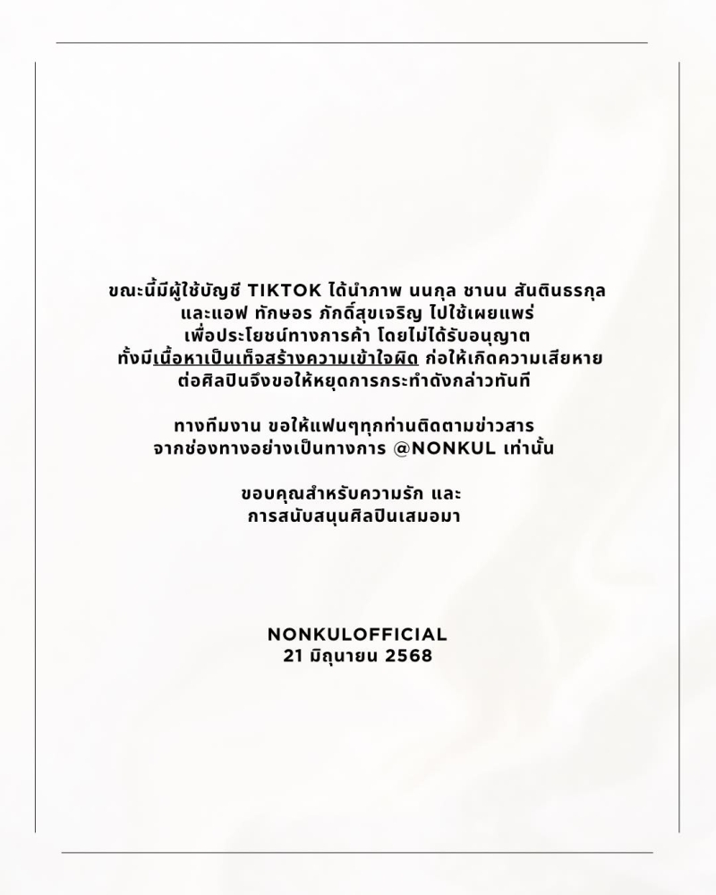 ขณะนี้มีผู้ใช้บัญชี TikTok ได้นำภาพ นนกุล ชานน สันติธรกุล และ แอฟ ทักษอร ไปใช้เผยแพร่เพื่อประโยชน์ทางการค้าโดยไม่ได้รับอนุญาต ทั้งมีเนื้อหาเป็นเท็จสร้างความเข้าใจผิด ก่อให้เกิดความเสียหายต่อศิลปิน จึงขอให้หยุดการกระทำดังกล่าวทันที ทางทีมงาน ขอให้แฟนๆทุกท่านติดตามข่าวสารจากช่องทางอย่างเป็นทางการ @NONKUT ขอบคุณสำหรับความรักและสนับสนุนศิลปินเสมอมา