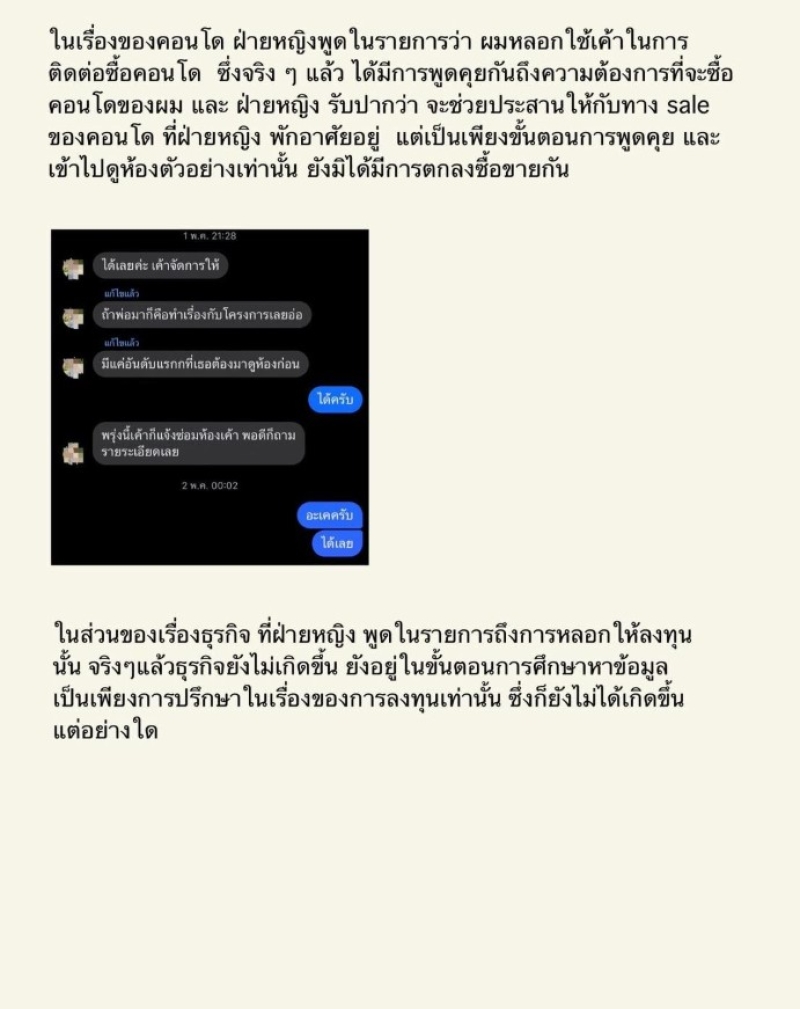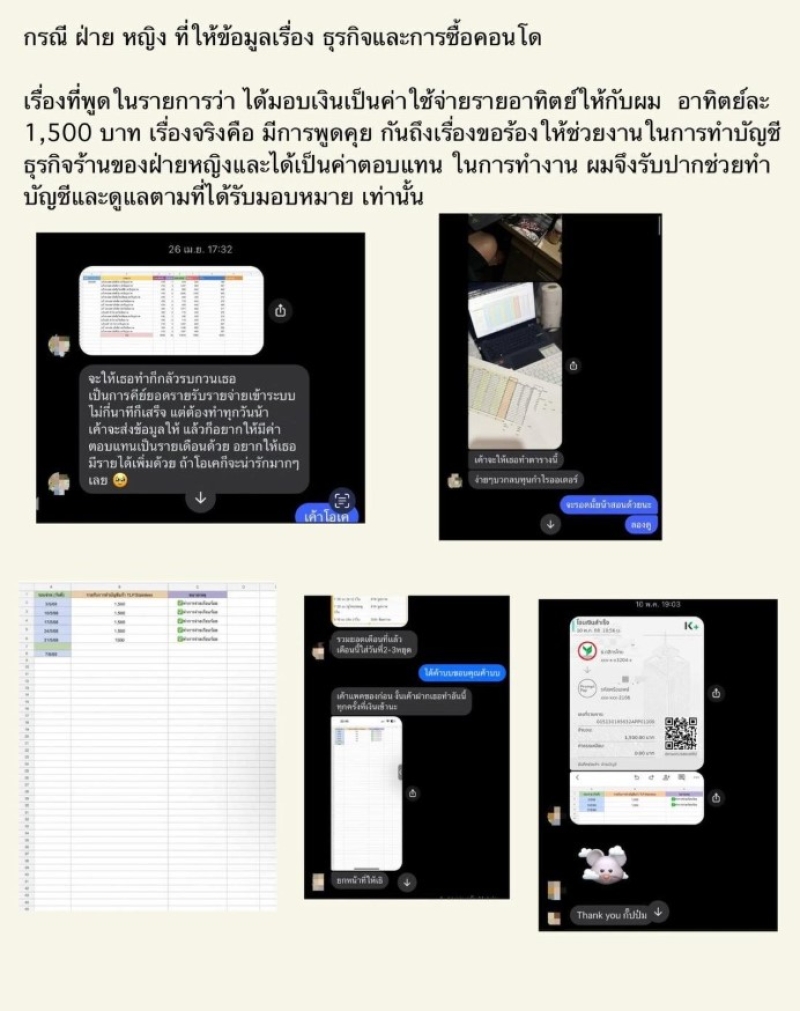 – เรื่องมอบเงินให้อาทิตย์ละ 1,500 บาท เป็นการช่วยทำบัญชีธุรกิจให้ร้านของฝ่ายหญิงตามที่ร้องขอ ส่วนเรื่องคอนโด มีการพูดคุยจริงว่าอยากซื้อ ฝ่ายหญิงรับปากจะประสานเซลล์ให้ และเข้าไปดูห้องตัวอย่าง ยังไม่ได้ตกลงซื้อขายกัน