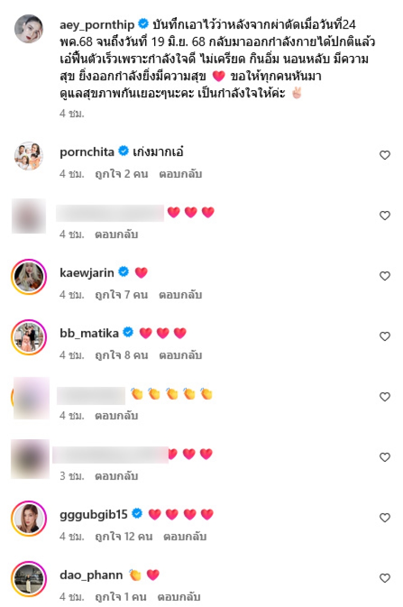 บันทึกเอาไว้ว่าหลังจากผ่าตัดเมื่อวันที่24 พค.68 จนถึงวันที่ 19 มิ.ย. 68 กลับมาออกกำลังกายได้ปกติแล้ว เอ๋ฟื้นตัวเร็วเพราะกำลังใจดี ไม่เครียด กินอิ่ม นอนหลับ มีความสุข ยิ่งออกกำลังยิ่งมีความสุข ขอให้ทุกคนหันมาดูแลสุขภาพกันเยอะๆนะคะ เป็นกำลังใจให้ค่ะ