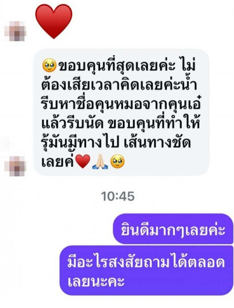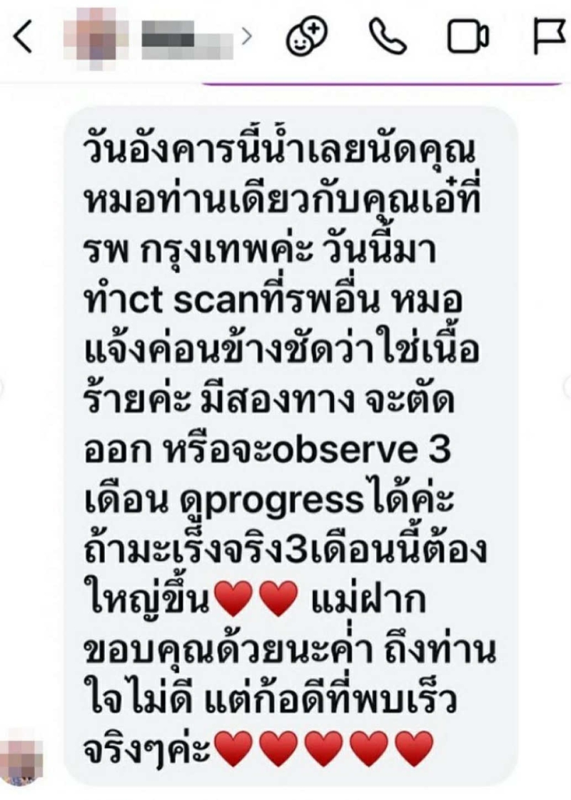 อีกทั้ง เอ๋ ยังเผยอีกว่า หลังจากที่ข่าวออกไป มีคนมาตรวจสุขภาพมากขึ้น และพบผู้ป่วยในระยะแรก 2-3 ราย ซึ่งสามารถรับการรักษาได้ทันเวลา เธอย้ำว่า โรคนี้ ใกล้ตัวกว่าที่คิด และหวังว่า เรื่องราวของ เธอ จะเป็นแรงบันดาลใจให้คนหันมาใส่ใจสุขภาพของตัวเองมากขึ้น