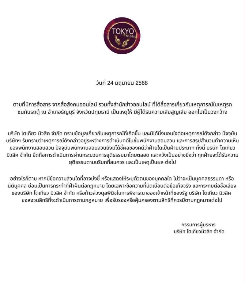 เรียกได้ว่า เป็นเรื่องที่ได้รับความสนใจในโลกออนไลน์ หลังจากที่แม่ของผู้เสียชีวิต อายุ 16 ปี ร้องขอความเป็นธรรม ในกรณีเหตุรถชนกับรถตู้ ที่อำเภอธัญบุรี จังหวัดปทุมธานี ล่าสุด (24 มิ.ย. 68) บริษัท โตเกียว มิวสิค จำกัด ได้ออกมาชี้แจงเกี่ยวกับเหตุการณ์ดังกล่าวที่เกิดขึ้น