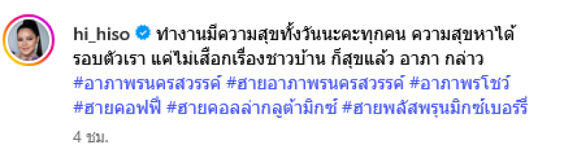ล่าสุด ฮาย ได้ออกมาเคลื่อนไหวผ่านทางอินสตาแกรม hi_hiso ระบุว่า ทำงานมีความสุขทั้งวันนะคะทุกคน ความสุขหาได้รอบตัวเรา แค่ไม่เสือกเรื่องชาวบ้าน ก็สุขแล้ว อาภา กล่าว