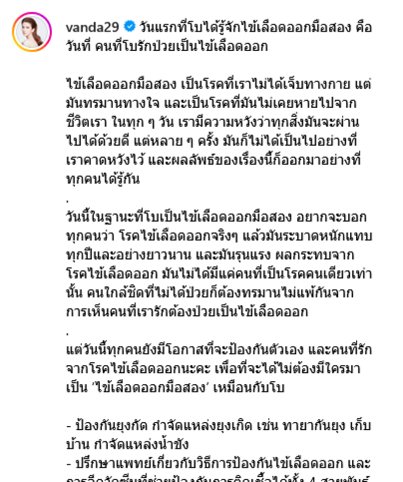 จากกรณีของ ปอ ทฤษฎี ผู้ล่วงลับจากการป่วยโรคไข้เลือดออก ล่าสุดทางด้านภรรยา โบว์ แวนดา ได้ออกมาโพสต์คลิป ผ่านทางอินสตาแกรม vanda29 พร้อมเตือนป้องกันในวันที่ยังมีโอกาส ระบุว่า วันแรกที่โบได้รู้จักไข้เลือดออกมือสอง คือวันที่ คนที่โบรักป่วยเป็นไข้เลือดออก