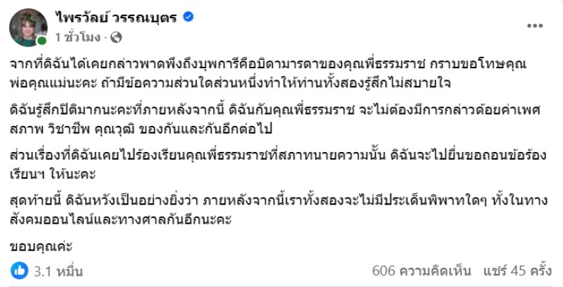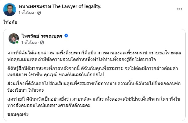 ด้านฝั่งของ ทนายธรรมราช เองก็ได้แชร์โพสต์ไปและเผยแคปชั่นสั้นๆว่า ให้อภัย