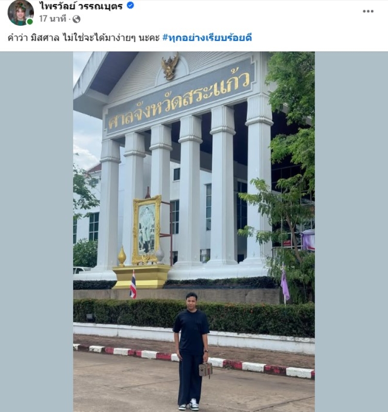 โดยทาง ไพรวัลย์ ก็ได้โพสต์เพิ่มอีกว่า คำว่า มิสศาล ไม่ใช่จะได้มาง่ายๆ นะคะ #ทุกอย่างเรียบร้อยดี