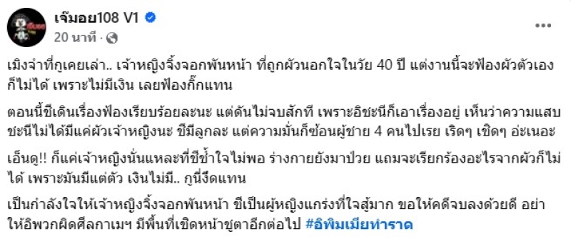 เรียกได้ว่า มีเรื่องราวต้องให้ชาวเน็ตตามสืบกันอีกแล้ว เมื่อล่าสุดทาง เจ๊มอย108 V1 ได้ออกมาเผยว่า เมิงจำที่กูเคยเล่า.. เจ้าหญิงจิ้งจอกพันหน้า ที่ถูกผัวนอกใจในวัย 40 ปี แต่งานนี้จะฟ้องผัวตัวเองก็ไม่ได้ เพราะไม่มีเงิน เลยฟ้องกิ๊กแทน