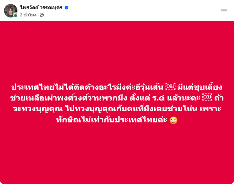 กลายเป็นประเด็นดราม่าร้อนแรงเลยทีเดียว ฮุน เซน แฉ ทักษิณ ชินวัตร อดีตนายกรัฐมนตรีของไทย แกล้งป่วย เพื่อหลอกลวงศาลและหลีกเลี่ยงการดำเนินคดีทางกฎหมายหลายคดี ล่าสุดทางด้าน แพรรี่ ไพรวัลย์ ได้ออกมาเคลื่อนไหวโพสต์เฟซบุ๊ค ไพรวัลย์ วรรณบุตร ระบุว่า