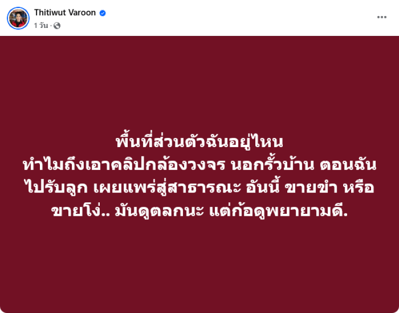 ล่าสุด บิ๊ก ผู้ใหญ่บ้านฟินแลนด์ ได้ออกมาโพสต์ผ่านทางเฟซบุ๊ค Thitiwut Varoon ระบุข้อความว่า พื้นที่ส่วนตัวฉันอยู่ไหน ทำไมถึงเอาคลิปกล้องวงจร นอกรั้วบ้าน ตอนฉันไปรับลูก เผยแพร่สู่สาธารณะ อันนี้ ขายขำ หรือขายโง่.. มันดูตลกนะ แต่ก้อดูพยายามดี