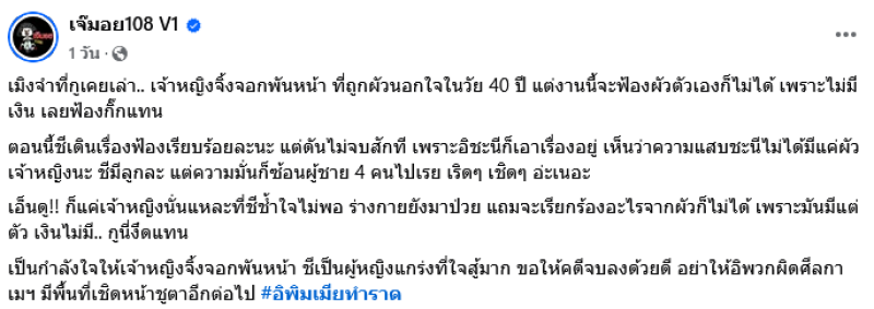ทำเอาชาวเน็ตต่างคอมเมนต์กันอย่างมากเมื่อทางด้านเพจ เจ๊มอย 108 V1 ได้ออกมาโพสต์ข้อความระบุว่า เจ้าหญิงจิ้งจอกพันหน้า ที่ต้องเผชิญวิบากกรรมโดนสามีนอกใจในวัย 40 กะรัต แถมงานนี้พีคในพีค! เพราะเธอไม่สามารถฟ้องสามีได้ เนื่องจากอีกฝ่ายไร้ทรัพย์สิน จึงต้องหันหัวฟ้องเมียน้อยแทน