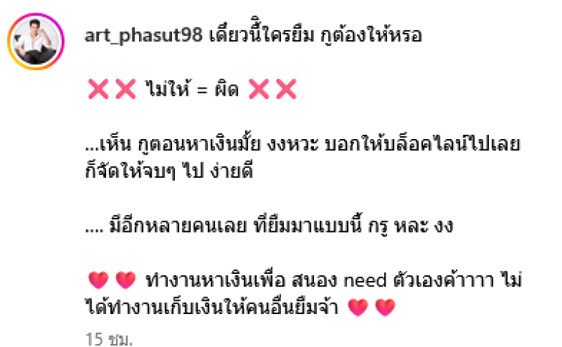 เรียกได้ว่าเป็นอีกหนึ่งพระเอกหนุ่มมากฝีมือสำหรับ อาร์ต พศุตม์ พ่อค้าหมูกรอบ ที่ล่าสุดทนไม่ไหวเมื่อมีคนทักเข้ามาขอยืนเงิน โดยได้แคปแชทพร้อมโพสต์ข้อความผ่านทางอินสตาแกรม art_phasut98 ระบุว่า