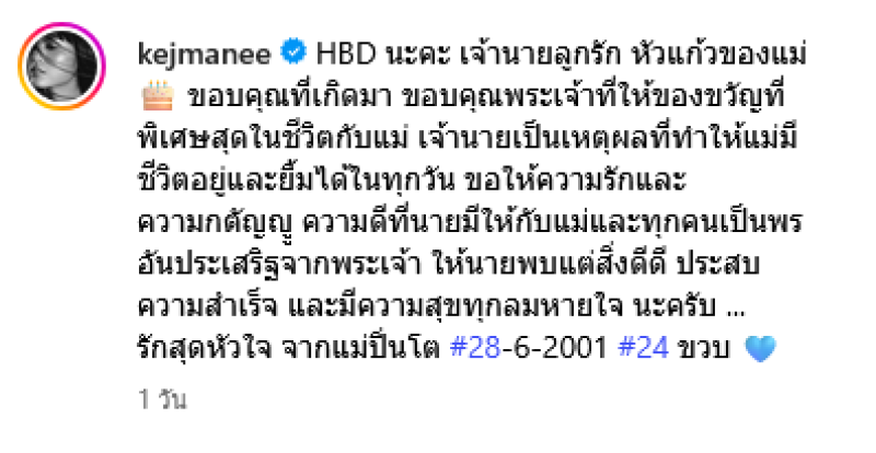 เรียกได้ว่ายังเป็นมิตรภาพเเละทำหน้าที่ดีสำหรับ แม่ปิ่น เก็จมณี และอดีตคนรัก เจ เจตริน ล่าสุด เจ้านาย จินเจษฎ์ วรรธนะสิน ลูกชายคนโต เข้าสู่วัย 24 แล้ว ทั้งคู่ต่างพร้อมใจโพสต์อวยพรกันอย่างสุดซึ้ง โดยคุณแม่ ได้ระบุเเคปชั่นว่า HBD นะคะ เจ้านายลูกรัก หัวแก้วของแม่ ขอบคุณที่เกิดมา ขอบคุณพระเจ้าที่ให้ของขวัญที่พิเศษสุดในชีวิตกับแม่