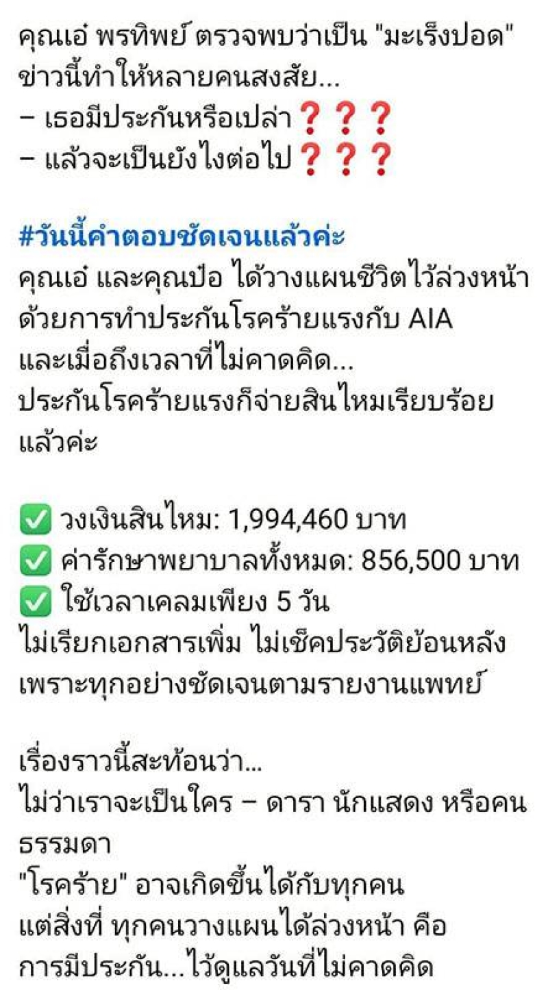 จากกรณีที่ก่อนหน้านี้ทางด้าน ป๋อ ณัฐวุฒิ สกิดใจ ได้ประกาศข่าวร้ายว่าภรรยา เอ๋ พรทิพย์ ป่วยเป็นมะเร็งปอด ระยะที่ 1 ท่ามกลางแฟนๆเเละคนในวงการต่างตกใจกันอย่างมาก แต่ในความโชคร้ายก็ยังมีโชคดี เพราะทั้งคู่ได้เงินประกันจากที่ทำเอาไว้กับเจ้าหนึ่งเกือบ 2 ล้านบาทจากการตรวจพบว่าป่วยเป็นมะเร็ง