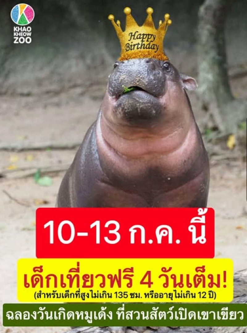 ทาง สวนสัตว์เปิดเขาเขียว จ.ชลบุรี เตรียมเซอร์ไพรส์แฟนๆ ด้วยการจัดกิจกรรมพิเศษในโอกาสครบรอบ 1 ปีของ น้องหมูเด้ง ฮิปโปโปเตมัสแคระ ที่ได้รับความนิยมอย่างสูง โดยเปิดโอกาสให้เด็กๆ เข้าเที่ยวสวนสัตว์ฟรีตลอด 4 วัน ตั้งแต่วันที่ 10 ถึง 13 กรกฎาคม 2568