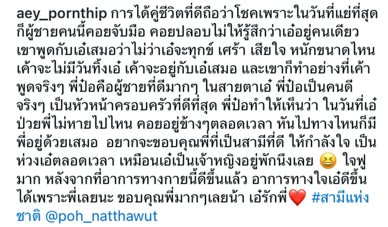 เรียกได้ว่า เป็นเรื่องราวที่เรียกเสียงชื่นชมจากแฟนๆ หลายคน เมื่อ เอ๋ พรทิพย์ ภรรยา ของ ป๋อ ณัฐวุฒิ ได้แชร์ข้อความผ่านอินสตาแกรม aey_pornthip เพื่อขอบคุณ และชื่นชม สามี ที่อยู่เคียงข้าง เธอ ในช่วงเวลาที่ยากลำบาก จากการต่อสู้กับโรคร้ายมะเร็งปอดระยะเริ่มต้น