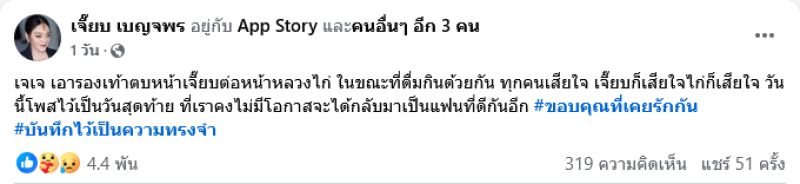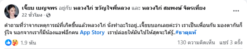 ต่อมาได้โพสต์ข้อความอีกว่า คำถามที่ว่าจากเหตุการณ์ที่เกิดขึ้นแล้วหลวงไก่ นั่งทำอะไรอยู่..เจี๊ยบบอกเลยค่ะว่า เราเป็นเพื่อนกัน มองตากันก็รู้ใจ นอกจากเราก็มีน้องแอฟอีกคน App Story เราปล่อยให้มันไปให้สุดจะได้รู้..#ธาตุแท้ ท่ามกลางคนในวงการเเละเเฟนๆต่างส่งกำลังใจกันอย่างมาก