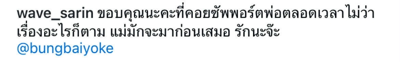 ล่าสุด เวฟ สาริน โพสต์ภาพ ภรรยา สุดที่รัก บุ้ง ใบหยก ที่กำลังจุ๊บแก้ม พร้อมข้อความว่า ขอบคุณนะคะ ที่คอยซัพพอร์ตพ่อตลอดเวลา ไม่ว่าเรื่องอะไรก็ตาม แม่ มักจะมาก่อนเสมอ รักนะจ๊ะ