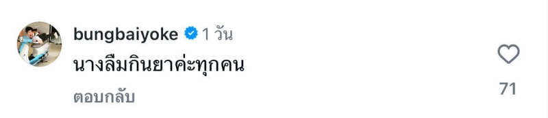 โดย ข้อความนี้ แสดงออกถึงความรัก และความขอบคุณจากใจจริงนี้ แต่แล้ว ทันใดนั้น ความหวานที่กำลังก่อตัวขึ้น ก็ถูกขัด เมื่อ บุ้ง ใบหยก เข้ามาคอมเมนต์ตอบกลับใต้โพสต์ สามี แบบช็อตฟีลมาก ว่า นางลืมกินยาค่ะทุกคน ทำเอาแฟนคลับ และชาวเน็ตถึงกับขำไปตามๆ กัน เพราะเป็นคำตอบที่ดึงอารมณ์จากความหวาน กลายเป็นความฮาทันที