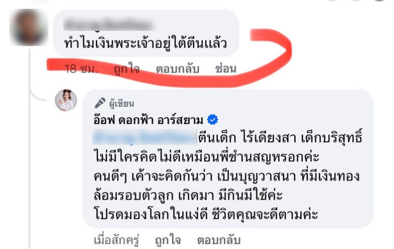 กลายเป็นประเด็นดรามา่าทันทีสำหรับนักร้องสาวดัง อ๊อฟ ดอกฟ้า อาร์สยาม ที่ได้โพสต์ภาพลูกชาย น้องบิ๊กเอ็ม นอนบนกองเงินกองทอง โดยมีชาวเน็ตเข้ามาคอมเมนต์ว่า ทำไมเงินพระเจ้าอยู่ใต้ตีxแล้ว ทั้งนี้ อ๊อฟ ได้ตอบกลับคอมเมนต์ทันทีว่า