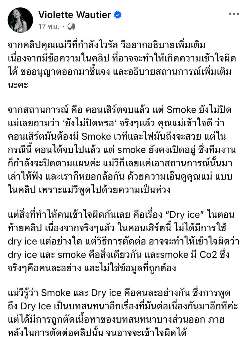 ซึ่ง คลิปดังกล่าว ที่ วี วิโอเลต ได้นำมาเผยแพร่ใน TikTok violettewautier ทำให้เกิดการเข้าใจผิด เกี่ยวกับเรื่องของ Dry Ice และ Smoke ทำให้หลายคนสับสน เกี่ยวกับสิ่งที่คุณแม่พูดในคลิป