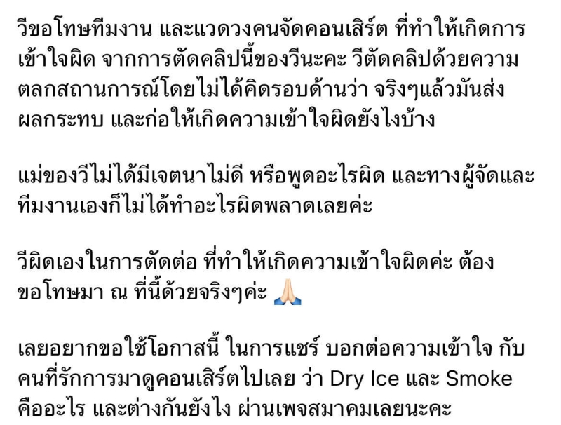 เรียกได้ว่า หลายคนคงรู้จัก กับ นักร้องสาว วี วิโอเลต วอเทียร์ ล่าสุด ออกมาชี้แจงแล้ว ปมคลิป คุณแม่ พูดถึง Dry Ice และ Smoke ในงานคอนเสิร์ต กลายเป็นกระแสแรง จนทำให้เกิดความเข้าใจผิด