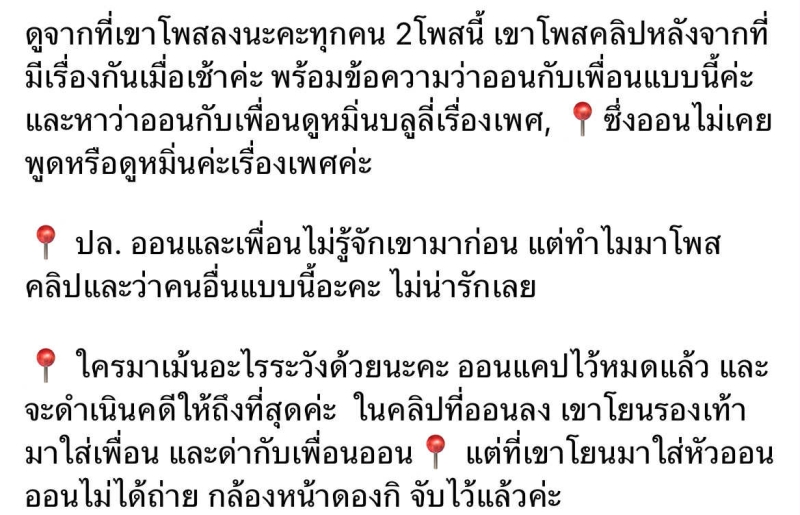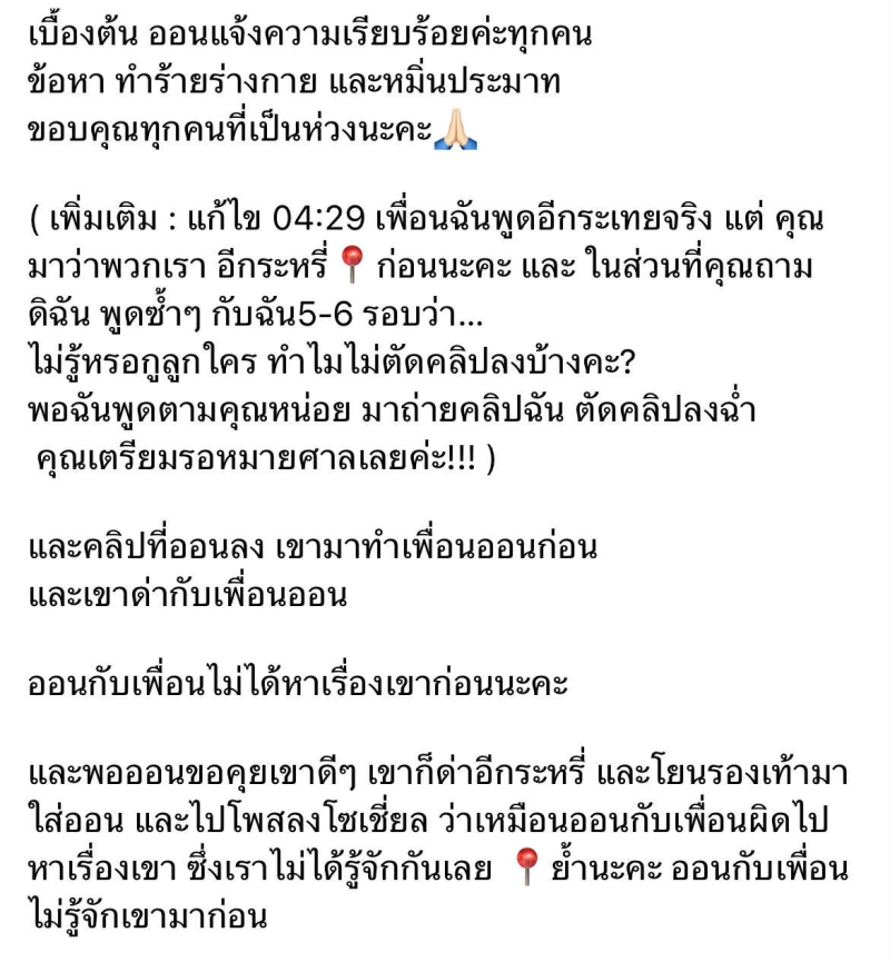 นอกจากนี้ ออน ยังได้เปิดเผยว่า คลิปที่โพสต์ในโซเชียล ถูกตัดต่อออกมาอย่างไม่ถูกต้อง ฝ่ายที่เป็นคู่กรณี ได้กล่าวหาว่า ทั้งออน และเพื่อนของ เธอ เป็นผู้เริ่มเรื่อง ก่อนจะมีการโยนรองเท้า และด่าทอ พร้อมทั้งโพสต์ในสตอรี่ จนเกิดการเข้าใจผิด