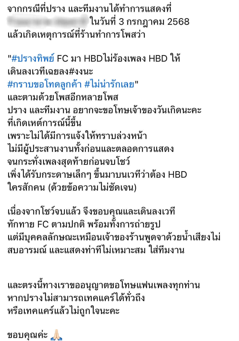 เรียกได้ว่า หลายคนคงรู้จักกันดี กับ ปราง ปรางทิพย์ นักร้องสาว ที่ออกมาชี้แจง ร้านแห่งหนึ่งในจังหวัดปทุมธานี โพสต์ข้อความแขวะแรง ปมไม่ร้องเพลง Happy Birthday ให้กับลูกค้า ในงานวันเกิด