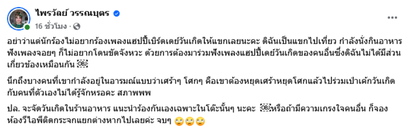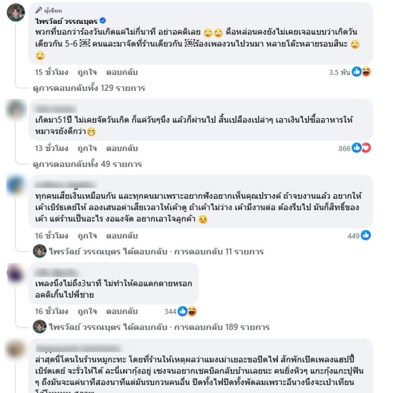 อย่าว่าแต่นักร้องไม่อยากร้องเพลงแฮปปี้เบิร์ดเดย์วันเกิดให้แขกเลยนะคะ ดิฉันเป็นแขกไปเที่ยว กำลังนั่งกินอาหารฟังเพลงจอยๆ ก็ไม่อยากโดนขัดจังหวะ ด้วยการต้องมาร่วมฟังเพลงแฮปปี้เดย์วันเกิดของคนอื่นซึ่งดิฉันไม่ได้มีส่วนเกี่ยวข้องเหมือนกัน