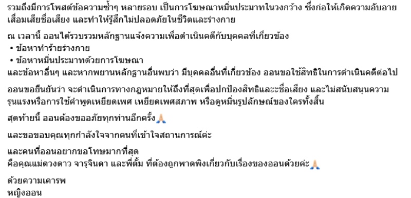 และยืนยันว่าจะดำเนินการทางกฎหมายให้ถึงที่สุด เพื่อปกป้องสิทธิและชื่อเสียง และไม่สนับสนุนความรุนแรง หรือการใช้คำพูดเหยียดเพศ เหยียดเพศสภาพ หรือดูหมิ่นรูปลักษณ์ของใครทั้งสิ้น และคนที่ออนอยากขอโทษมากที่สุด คือคุณแม่ดวงดาว จารุจินดา และพี่ตั้ม ที่ต้องถูกพาดพิงเกี่ยวกับเรื่องของออนด้วยค่ะ ด้วยความเคารพ
