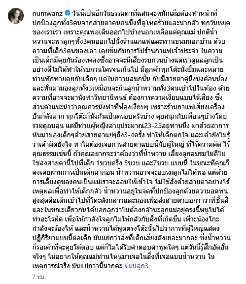 และในขณะเดียวกันได้บอกลูกว่าไม่ต้องกลัวนะลูกแม่อยู่ตรงนี้หนูไม่ได้ทำอะไรผิด เพื่อให้กำลังใจลูกไม่ให้กลัวกับสิ่งที่เกิดขึ้น เพราะน้องโกะกำลังจะร้องไห้ และน้ำหวานได้พูดตรงโต๊ะนั้นไปว่าการที่ผู้ใหญ่แสดงปฏิกิริยาแบบนี้ต่อเด็ก มันแย่กว่าสิ่งที่เด็กเสียงดังเยอะมากคะ ซึ่งน้ำหวานก็รอเค้าที่จะคุยโต้ตอบ แต่ก็ไม่ได้รับคำตอบคำพูดใดๆ แต่วันนี้รู้สึกอัดอั้นจริงๆ ไม่อยากให้คุณแม่ท่านไหนมาเจอในสิ่งที่เจอแบบน้ำหวาน ในเหตุการณ์จริง มันแย่กว่านี้มากคะ #แม่ลูก3