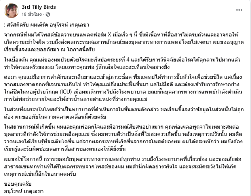 จากประเด็นของนักร้องหนุ่ม เติร์ด Tilly Birds ได้โพสต์กล่าวหาการรักษาพยาบาลของเจ้าหน้าที่ทางการแพทย์ต่อแม่ของเขาที่ป่วยมะเร็งระยะที่ 4 จนเกิดความคลาดเคลื่อนในข้อมูล ล่าสุดเจ้าตัวได้ออกมาโพสต์ขอโทษผ่านเฟซบุ๊ค3rd Tilly Birds ระบุว่า จากกรณีที่ผมได้โพสต์ข้อความบนแพลตฟอร์ม X เมื่อเร็ว ๆ นี้ ซึ่งมีเนื้อหาที่สื่อสารไม่ครบถ้วนและอาจก่อให้เกิดความเข้าใจผิด