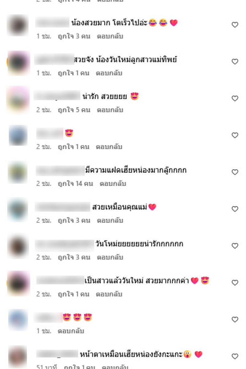 ท่ามกลางแฟนๆต่างเข้ามาคอมเมนต์ชื่นชมกันอย่างมาก อาทิ น้องสวยมาก โตเร็วไปอ่ะ,สวยจัง น้องวันใหม่ลูกสาวแม่ทิพย์,มีความแฝดเฮียหน่องมากลู๊ก,สวยเหมือนคุณแม่,เป็นสาวแล้ววันใหม่ สวยมากค่า,หน้าตาเหมือนเฮียหน่องยังกะแกะ เป็นต้น