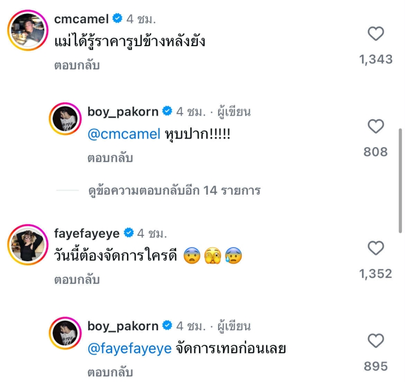 ต่อมา พี่อีกคน ก็เข้ามาคอมเมนต์ใต้ภาพว่า แม่ได้รู้ราคารูปข้างหลังยัง และเฟย์ พรปวีณ์ ก็ไม่พลาดร่วมวงด้วยว่า วันนี้ต้องจัดการใครดี