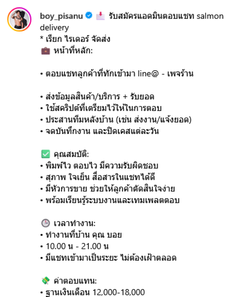 ล่าสุด บอย พิษณุ ได้ออกมาโพสต์ประกาศกลางไอจี ระบุว่า หาเพื่อนทำงาน 1 อัตรา พร้อมเขียนรายละเอียดอย่างชัดเจน