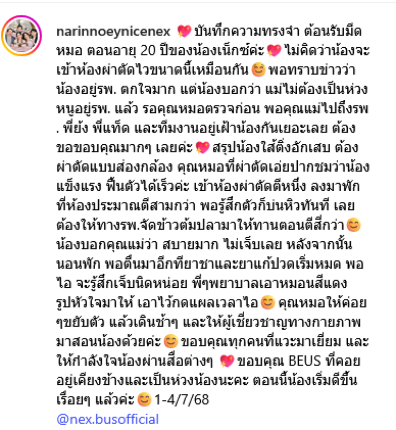 ขอบคุณทุกคนที่แวะมาเยี่ยม และให้กำลังใจน้องผ่านสื่อต่างๆ ขอบคุณ BEUS ที่คอยอยู่เคียงข้างและเป็นห่วงน้องนะคะ ตอนนี้น้องเริ่มดีขึ้นเรื่อยๆ แล้วค่ะ 1-4/7/68 @nex.busofficial
