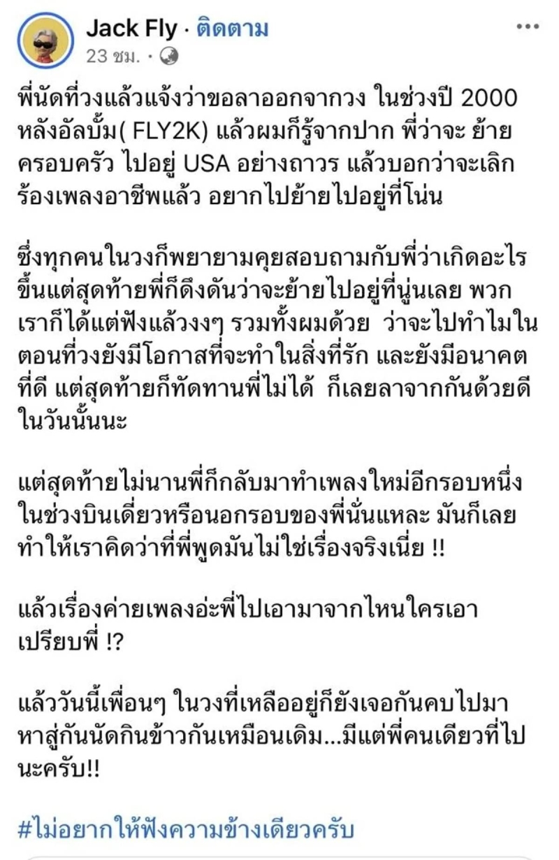 กลายเป็นประเด็นดราม่าวงดารเพลงยุค 90 เลยทีเดียวเมื่อก่อนหน้านี้ทางด้าน อี๊ด วงฟลาย อดีตนักร้อง ได้ออกมาเปิดใจผ่านสื่อถึงสาเหตุวงแตก พร้อมเล่าถึงปัญหาภายในวงที่ทำให้สมาชิกแยกย้ายกันไปในที่สุด ล่าสุดทางด้าน แจ็ค มือกีตาร์ และ ชาลี มือกลอง-นักแต่งเพลง ของวงฟลาย ได้ออกมาโต้ว่า