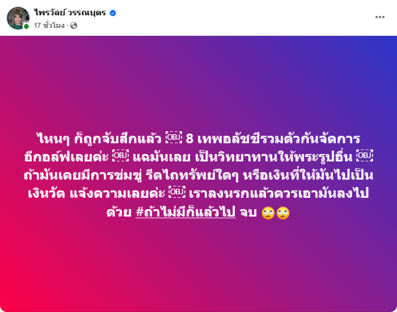 ล่าสุด แพรรี่ ไพรวัลย์ ได้ออกมาโพสต์ฟาดแรง ผ่านเฟซบุ๊คไพรวัลย์ วรรณบุตร ระบุว่า ไหนๆ ก็ถูกจับสึกแล้ว 8 เทพอลัชชีรวมตัวกันจัดการอีกอล์ฟเลยค่ะ แฉมันเลย เป็นวิทยาทานให้พระรูปอื่น ถ้ามันเคยมีการข่มขู่ รีดไถทรัพย์ใดๆ หรือเงินที่ให้มันไปเป็นเงินวัด แจ้งความเลยค่ะ เราลงนรกแล้ว ควรเอามันลงไปด้วย #ถ้าไม่มีก็แล้วไป จบ