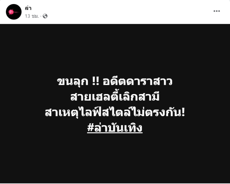 จากกรณีที่ก่อนหน้านี้เพจดัง อย่าง ล่า ก็ได้ออกมาเปิดประเด็นโดยได้โพสต์ว่า ขนลุก !! อดีตดาราสาว สายเฮลตี้เลิกสามี สาเหตุไลฟ์สไตล์ไม่ตรงกัน! #ล่าบันเทิง