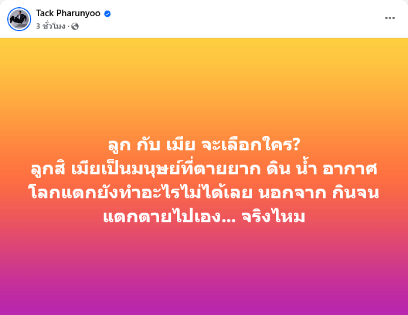 ลูก กับ เมีย จะเลือกใคร? ลูกสิ เมียเป็นมนุษย์ที่ตายยาก ดิน น้ำ อากาศ โลกแตกยังทำอะไรไม่ได้เลย นอกจาก กินจนแตกxายไปเอง จริงไหม พร้อมทั้งยังคอมเมนต์เพิ่มเติมใต้โพสต์อีกด้วย