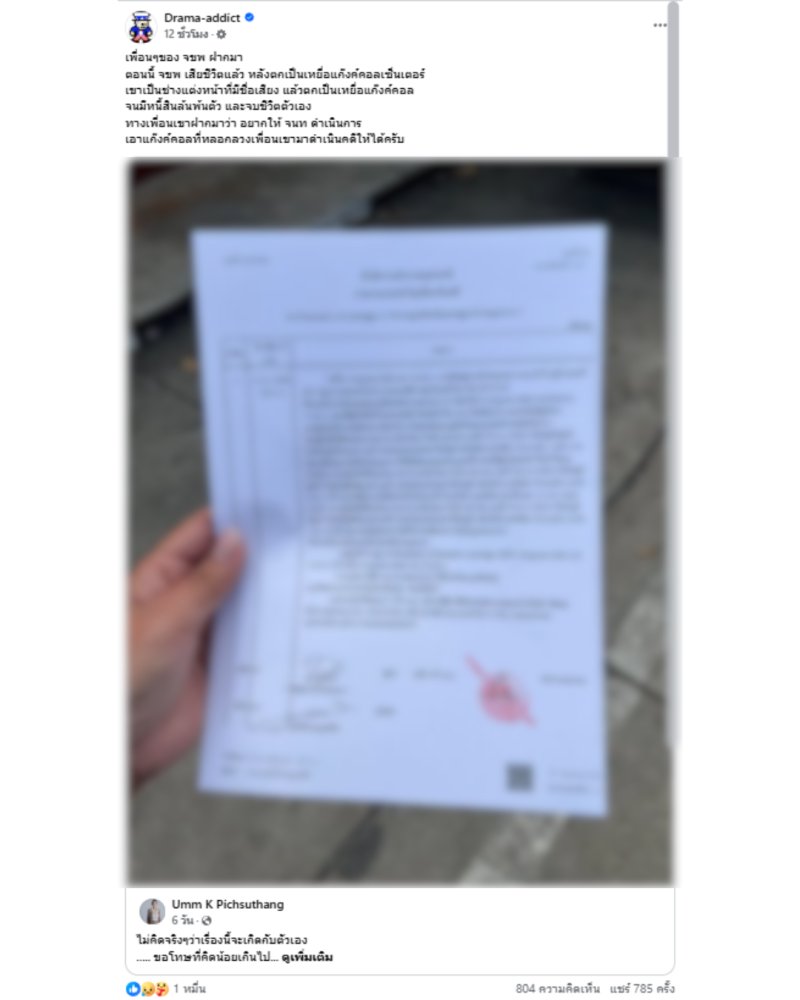 วันที่ 12 ก.ค.68 ที่ผ่านมา เฟซบุ๊กเพจ Drama-addict ได้แชร์เฟซบุ๊ก Umm K Pichsuthang ของคุณอั้ม พิชญ์สุธางค์ ไขแสงทอง อดีตพีดีมิสแกรนด์ขอนแก่น พร้อมระบุว่า เพื่อนๆ ของ จขพ.ฝากมา ตอนนี้ จขพ.เสียชีวิตแล้ว หลังตกเป็นเหยื่อแก๊งคอลเซ็นเตอร์ เขาเป็นช่างแต่งหน้าที่มีชื่อเสียง แล้วตกเป็นเหยื่อแก๊งคอล จนมีหนี้สินล้นพ้นตัว และจบชีวิตตัวเอง ทางเพื่อนเขาฝากมาว่า อยากให้ จนท.ดำเนินการ เอาแก๊งคอลที่หลอกลวงเพื่อนเขามาดำเนินคดีให้ได้