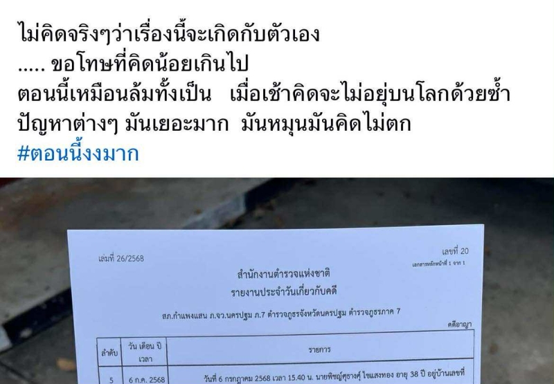 โดย มีข้อความว่า ไม่คิดจริงๆ ว่า เรื่องนี้ จะเกิดกับตัวเอง ขอโทษที่คิดน้อยเกินไป ตอนนี้ เหมือนล้มทั้งเป็น เมื่อเช้าคิดจะไม่อยู่บนโลกด้วยซ้ำ ปัญหาต่างๆ มันเยอะมาก มันหมุนมันคิดไม่ตก