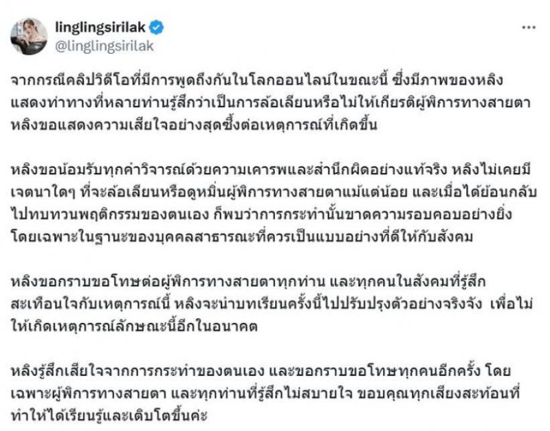กลายเป็นที่ถูกวิพากษ์วิจารณ์กันอย่างมากสำหรับนางเอกชื่อดังอย่าง หลิงหลิง ศิริลักษณ์ คอง หลังถูกสังคมวิจารณ์ล้อเลียนคนตาบอด ล่าสุด หลิงหลิง ได้ออกมาขอโทษพร้อมเผยว่า เป็นความผิดพลาดของหลิงที่ไม่ได้มีเจตนาเลยจริงๆ เหตุการณ์ทุกอย่างเกิดขึ้นไวมากเราอาจจะไม่ทันได้คิด