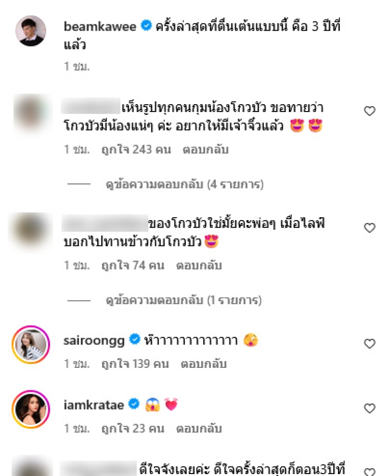 ท่ามกลางแฟนๆต่งเข้ามาคอมเมนต์คาดเดากันอย่างมาก อาทิ เห็นรูปทุกคนกุมน้องโกวบัว ขอทายว่าโกวบัวมีน้องแน่ๆ ค่ะ อยากให้มีเจ้าจิ๋วแล้ว,ห๊า,ดีใจจังเลยค่ะ ดีใจครั้งล่าสุดก็ตอน3ปีที่แล้วเหมือนกันเลยค่ะพ่อพ่อ,เฉลยด้วยค่ะพ่อพ่อ,พ่อๆ อย่าบอกนะว่า,ตื่นเต้นแล้วพ่อๆ เป็นต้น