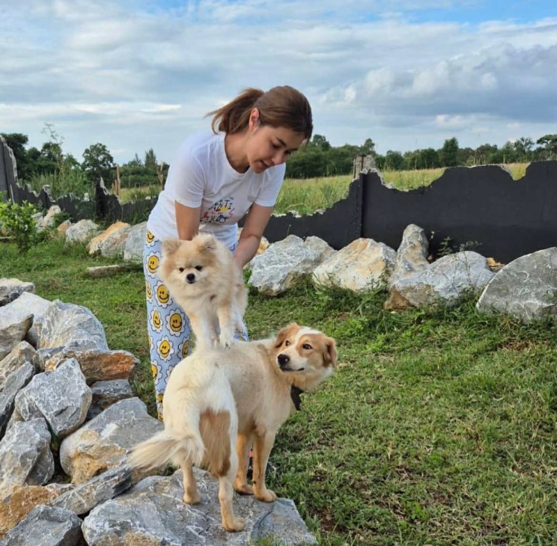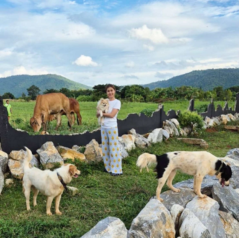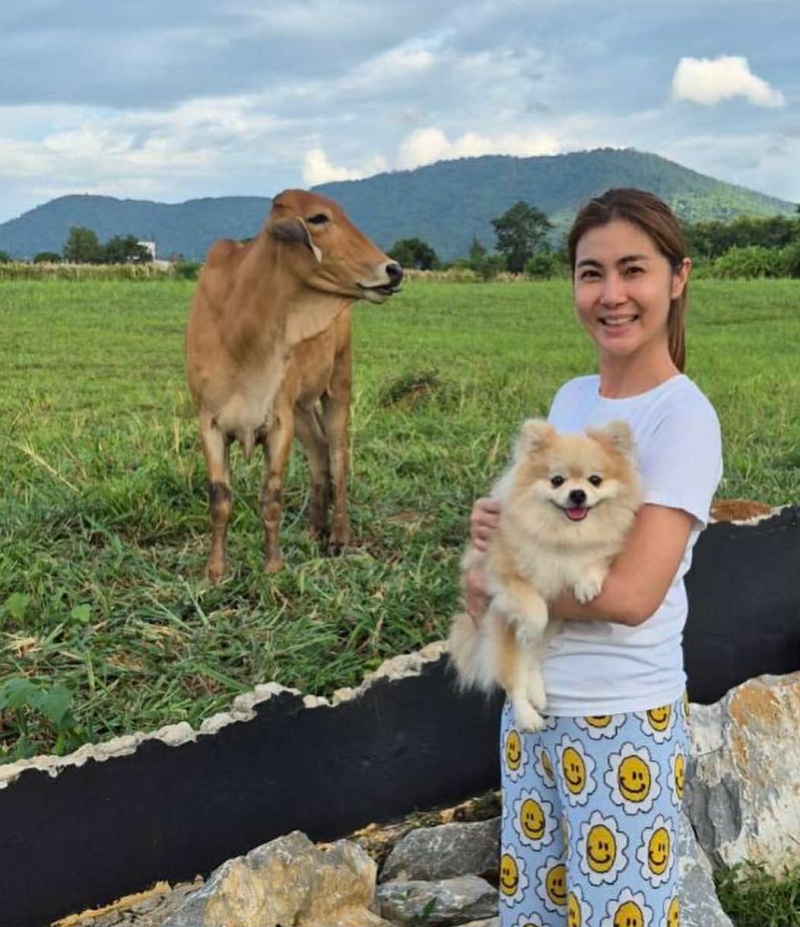 ซึ่ง ในภาพ ยังมีโมเมนต์สุดน่ารักตามมา เมื่อ น้องมะลิ ลูกสาวขนฟูของทั้งคู่ ขึ้นขี่หลังวัว ที่เดินเล็มหญ้าหลังบ้าน ท่ามกลางทุ่งหญ้า ซึ่งสร้างความอบอุ่น และน่ารักให้กับผู้ที่เห็น