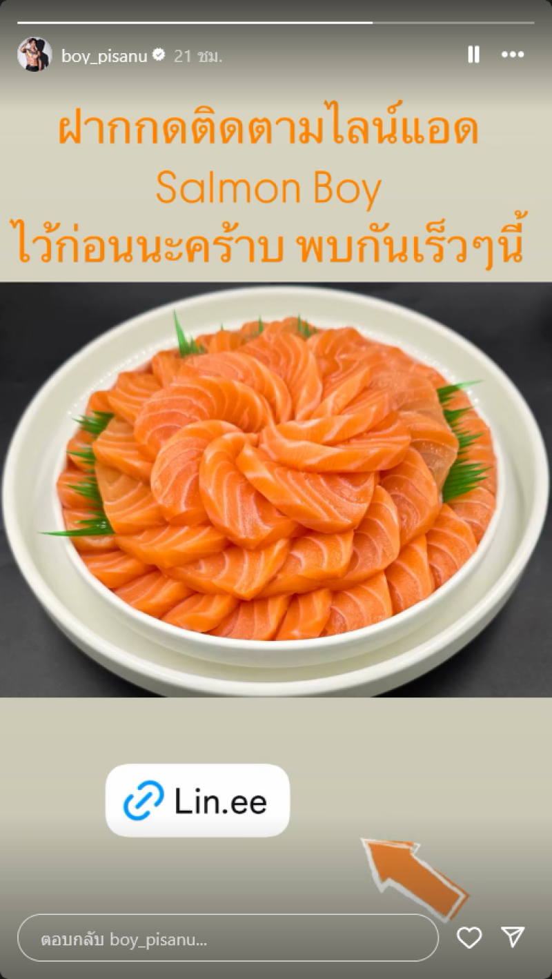 เป็นการเตรียมเปิดตัวขายของกิน โดยเลือกขาย ปลาแซลมอน ภายใต้ชื่อแบรนด์ Salmon Boy ซึ่งกำลังจะเปิดขายเร็วๆ นี้ พร้อมเขียนข้อความว่า ขอให้ทุกคนช่วยติดตาม Salmon Boy เร็วๆ นี้นะครับ