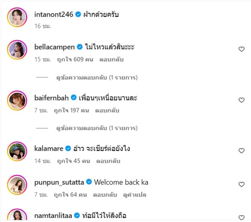 ท่ามกลาง เพื่อนๆในวงการเข้ามาคอมเมนต์กันจำนวนมาก ทาง เบลล่า ราณี ยังบอกว่า ไม่ไหวแล้วสินะะะ ด้านเพื่อนสนิทอย่าง ใบเฟิร์น พิมพ์ชนก มาคอมเมนต์บอกว่า เพื่อนๆเหนื่อยนานละ