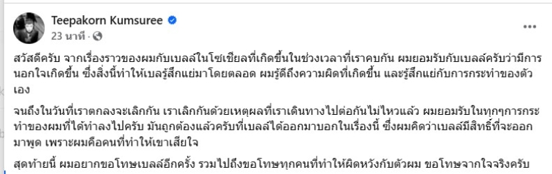 จนถึงในวันที่เราตกลงจะเลิกกัน เราเลิกกันด้วยเหตุผลที่เราเดินทางไปต่อกันไม่ไหวแล้ว ผมยอมรับในทุกๆการกระทำของผมที่ได้ทำลงไปครับ มันถูกต้องแล้วครับที่เบลล์ได้ออกมาบอกในเรื่องนี้ ซึ่งผมคิดว่าเบลล์มีสิทธิ์ที่จะออกมาพูด เพราะผมคือคนที่ทำให้เขาเสียใจ สุดท้ายนี้ ผมอยากขอโทษเบลล์อีกครั้ง รวมไปถึงขอโทษทุกคนที่ทำให้ผิดหวังกับตัวผม ขอโทษจากใจจริงครับ