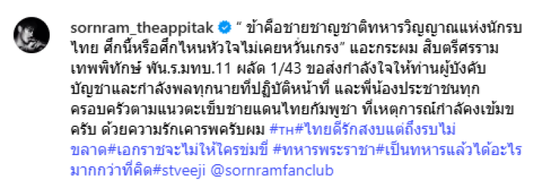 ข้าคือชายชาญชาติทหารวิญญาณแห่งนักรบไทย ศึกนี้หรือศึกไหนหัวใจไม่เคยหวั่นเกรง และกระผม สิบตรีศรราม เทพพิทักษ์ พัน.ร.มทบ.11 ผลัด 1/43 ขอส่งกำลังใจให้ท่านผู้บังคับบัญชาและกำลังพลทุกนายที่ปฏิบัติหน้าที่ และพี่น้องประชาชนทุกครอบครัวตามแนวตะเข็บชายแดนไทยกัมพูชา ที่เหตุการณ์กำลัคงเข้มขครับ ด้วยความรักเคารพครับผม