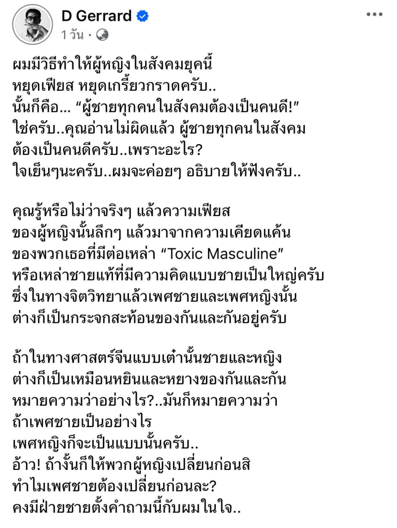 เรียกได้ว่า หลายคนคงรู้จักกันเป็นอย่างดี กับ บิ๊ก D Gerrard หรือ ที่รู้จักกันในชื่อ ไบรอัน เจอร์ราร์ด อุกฤษ วิลลีย์ บรอด ดอนกาเบียล เป็นทั้งนักร้อง และ นักเคลื่อนไหวด้านสังคม ที่มักจะไม่เกรงกลัวในการแสดงความคิดเห็น ล่าสุด เจ้าตัวได้โพสต์ข้อความยาวเหยียด ผ่านเฟซบุ๊ก D Gerrard เพื่อฝากถึงผู้ชายในสังคม