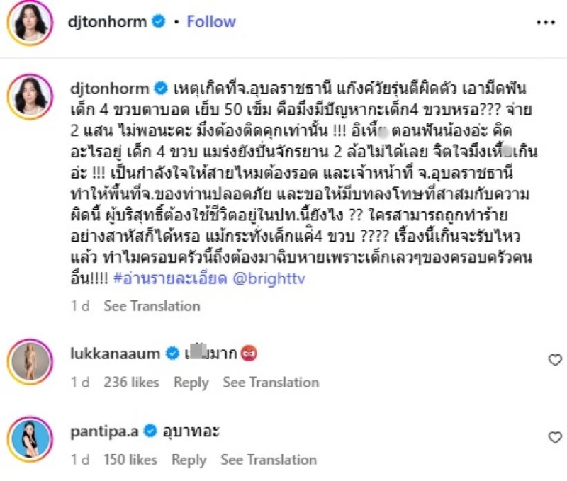 เหตุเกิดที่ จ.อุบลราชธานี แก๊งวัยรุ่นตีผิดตัว เอามีดฟันเด็ก 4 ขวบตาบอด เย็บ 50 เข็ม คือมึงมีปัญหากับเด็ก 4 ขวบหรอ??? จ่าย 2 แสนไม่พอนะคะ มึงต้องติดคุกเท่านั้น!!! อิเหี้x ตอนฟันน้องอ่ะคิดอะไรอยู่ เด็ก 4 ขวบแมร่งยังปั่นจักรยาน 2 ล้อไม่ได้เลย จิตใจมึงเหี้xเกินอ่ะ!!! พร้อมระบุเพิ่มเติมว่าเธอส่งกำลังใจให้น้องผู้บาดเจ็บ พร้อมเรียกร้องให้เจ้าหน้าที่ตำรวจจังหวัดอุบลราชธานีเร่งดำเนินคดีจนถึงที่สุด และลงโทษผู้ก่อเหตุให้สาสมกับความผิด ไม่ใช่แค่เงินเยียวยาเล็กน้อยเท่านั้นเป็นกำลังใจให้ สายไหมต้องรอด และเจ้าหน้าที่ จ.อุบลราชธานี ทำให้พื้นที่ของท่านปลอดภัย และขอให้มีบทลงโทษที่สาสมกับความผิดนี้... ผู้บริสุทธิ์ต้องอยู่ในประเทศนี้ยังไง? ใครสามารถถูกทำร้ายได้แม้กระทั่งเด็ก 4 ขวบ??? เรื่องนี้เกินจะรับไหว ทำไมครอบครัวนี้ถึงต้องมาฉิบหายเพราะเด็กเลวๆ ของครอบครัวคนอื่น!!!