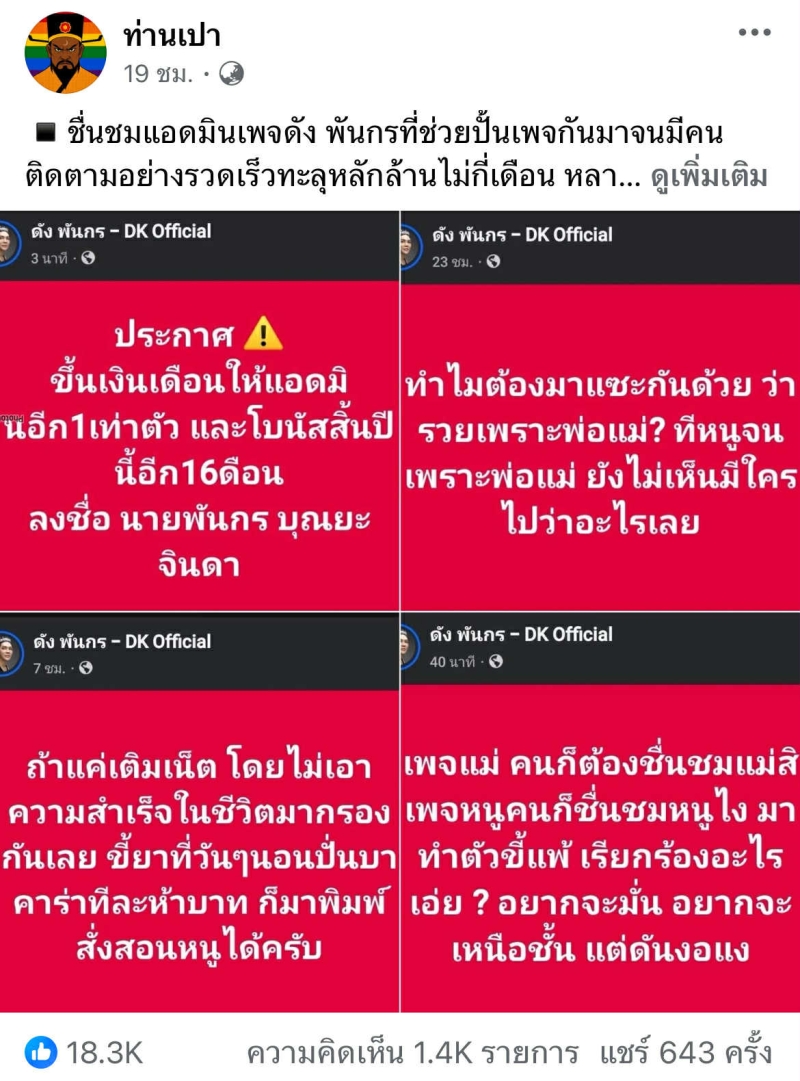 โดย เรื่องราวเริ่มต้น เมื่อ วันที่ 16 กรกฎาคม ที่ผ่านมา เพจ ท่านเปา ได้ออกมาเตือนเพจของ ดัง พันกร ว่า คอนเทนต์ที่เคยได้รับความนิยม และสร้างเสียงหัวเราะ จากการแซว และฟาดแรง เริ่มส่งผลกระทบต่อภาพลักษณ์ของศิลปิน เฉพาะในกรณี ที่วิจารณ์เรื่องส่วนตัวของบุคคลอื่นเกินไป จนทำให้ภาพลักษณ์ของศิลปินเสื่อมเสีย